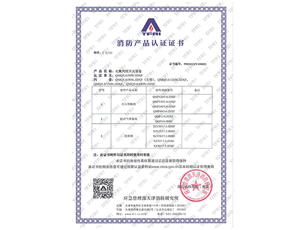 | 滅火劑名稱 | 七氟丙烷(HFC-227ea) |